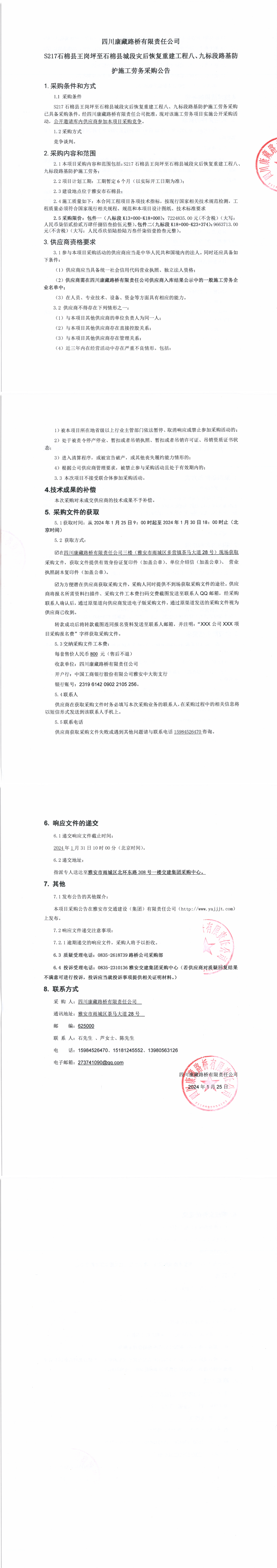 四川康藏路橋有限責(zé)任公司S217石棉縣王崗坪至石棉縣城段災(zāi)后恢復(fù)重建工程八、九標(biāo)段路基防護(hù)施工勞務(wù)采購公告