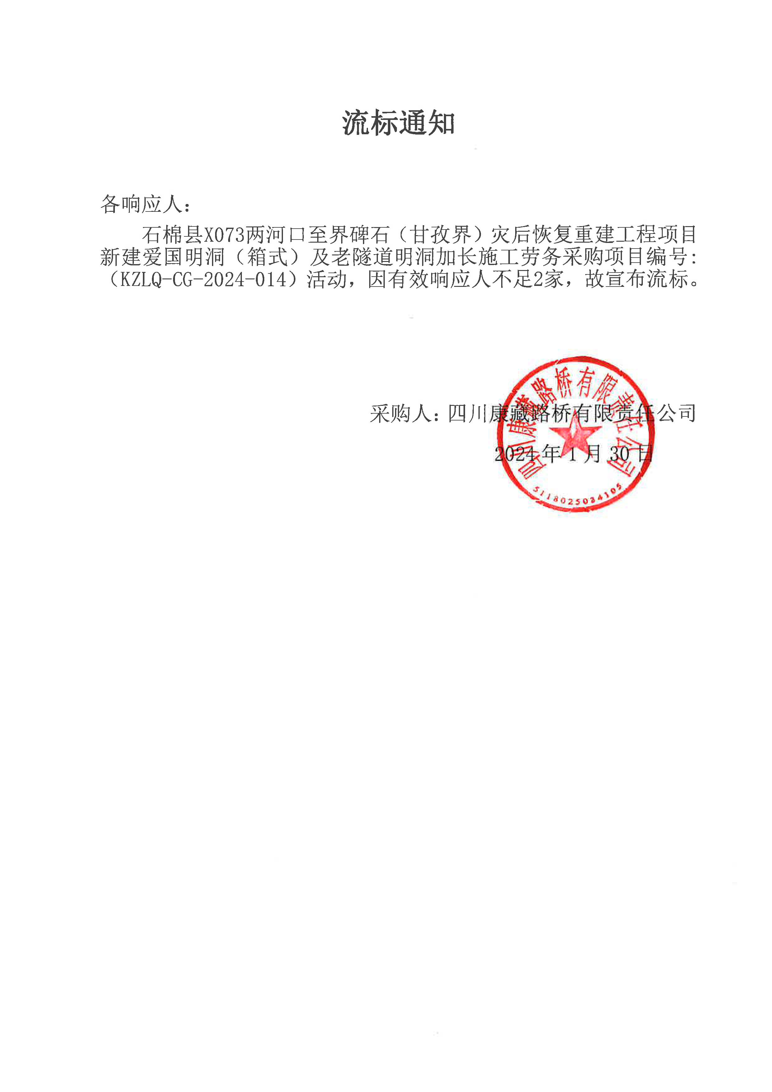 四川康藏路橋有限責(zé)任公司石棉縣X073兩河口至界碑石 (甘孜界)災(zāi)后恢復(fù)重建工程項目新建愛國明洞(箱式)及老隧道明洞加長施工勞務(wù)流標通知