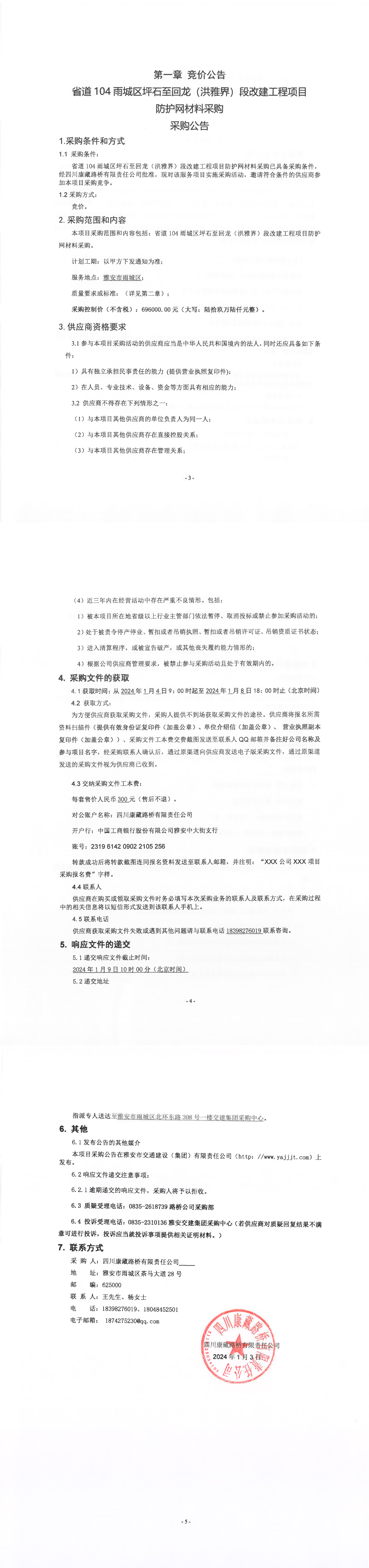 四川康藏路橋有限責(zé)任公司省道104雨城區(qū)坪石至回龍(洪雅界)段改建工程項目防護(hù)網(wǎng)材料采購公告