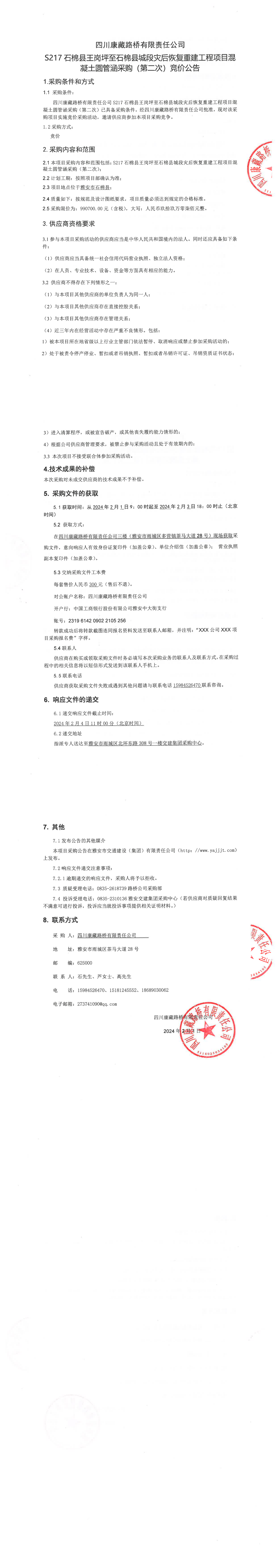 四川康藏路橋有限責(zé)任公司S217石棉縣王崗坪至石棉縣城段災(zāi)后恢復(fù)重建工程項(xiàng)目混凝土圓管涵采購(第二次)競價(jià)公告