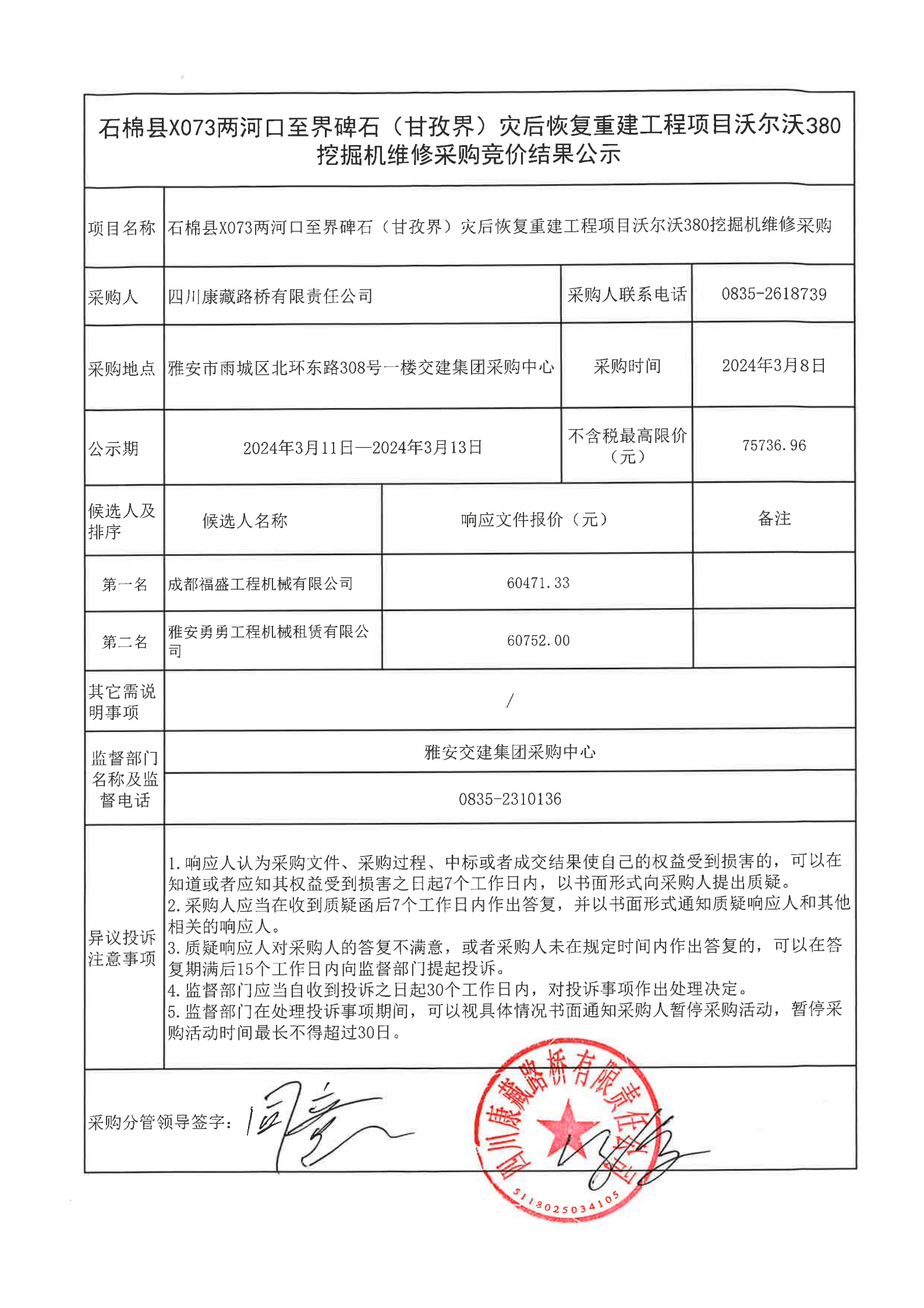 四川康藏路橋有限責(zé)任公司石棉縣X073兩河口至界碑石(甘孜界)災(zāi)后恢復(fù)重建工程項(xiàng)目沃爾沃380挖掘機(jī)維修采購競價結(jié)果公示