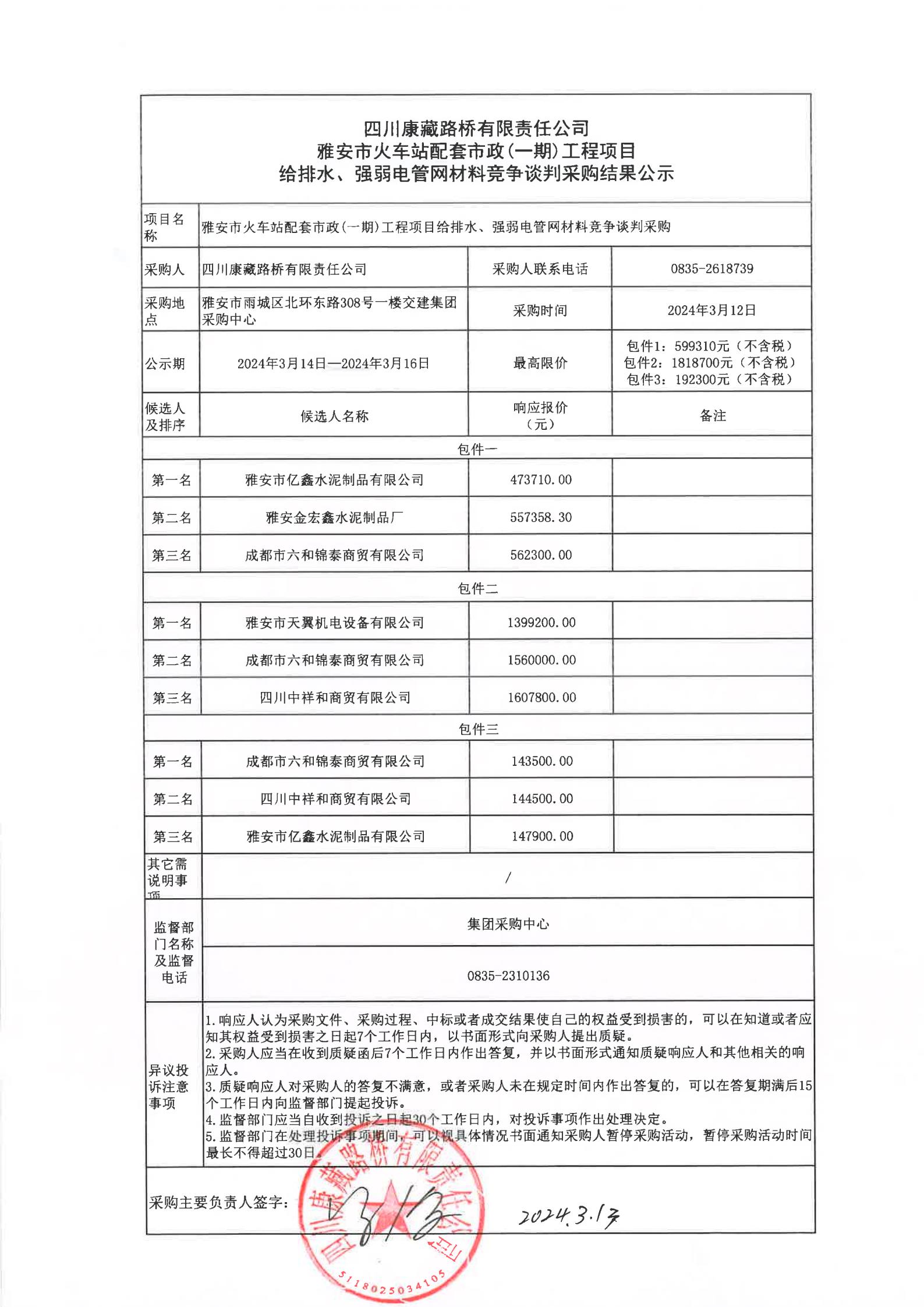 四川康藏路橋有限責(zé)任公司雅安市火車(chē)站配套市政(一期)工程項(xiàng)目給排水、強(qiáng)弱電管網(wǎng)材料采購(gòu)結(jié)果公示