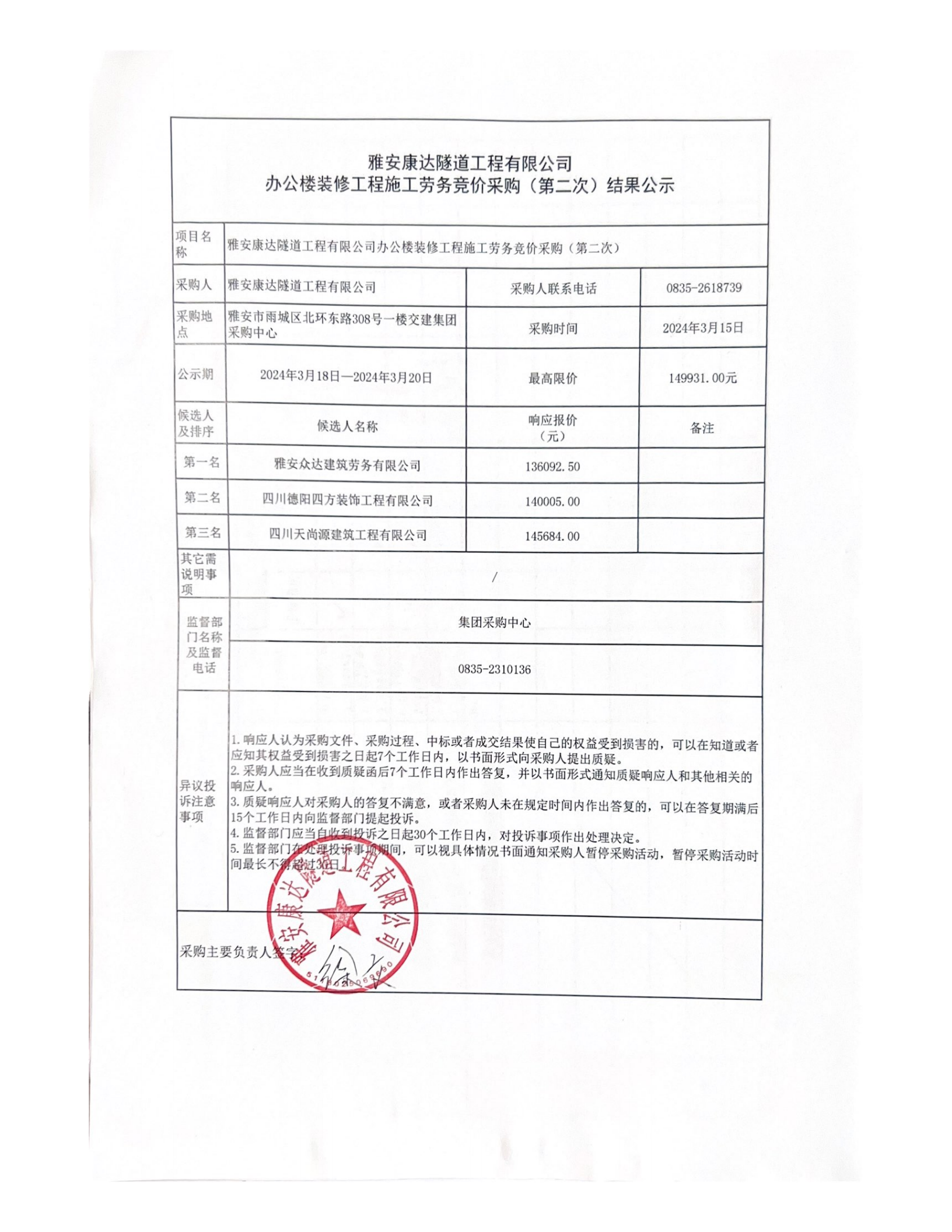 雅安康達(dá)隧道工程有限公司辦公樓裝修工程施工勞務(wù)競(jìng)價(jià)采購(gòu)(第二次)結(jié)果公示