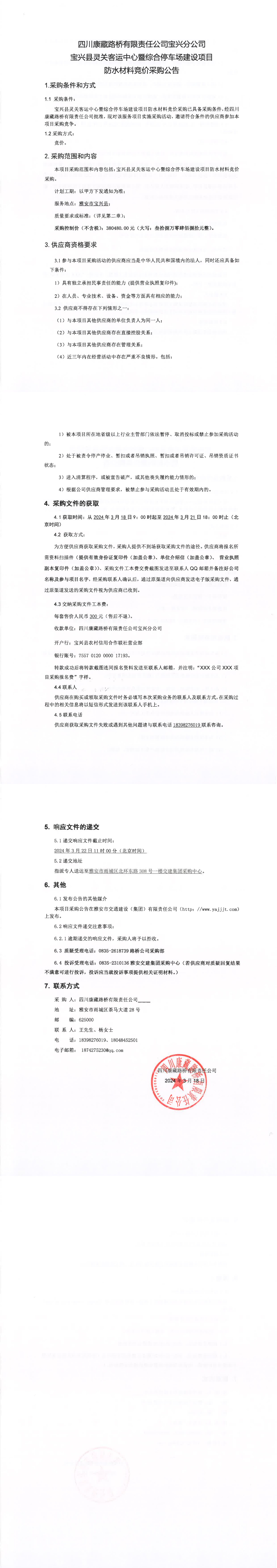 四川康藏路橋有限責(zé)任公司寶興縣靈關(guān)客運(yùn)中心暨綜合停車場建設(shè)項目防水材料競價采購公告