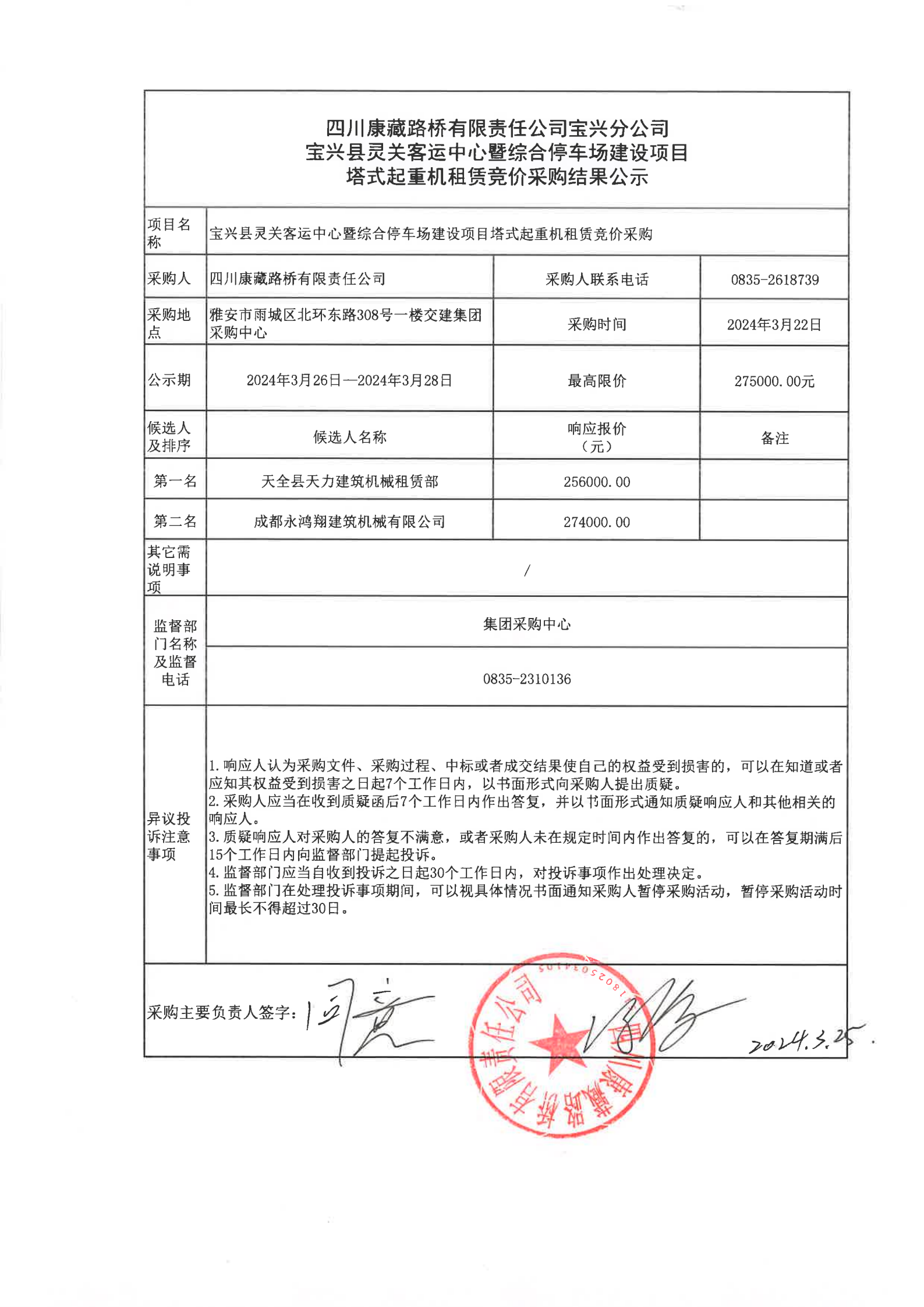 四川康藏路橋有限責(zé)任公司寶興縣靈關(guān)客運(yùn)中心暨綜合停車場(chǎng)建設(shè)項(xiàng)目塔式起重機(jī)租賃競(jìng)價(jià)采購結(jié)果公示