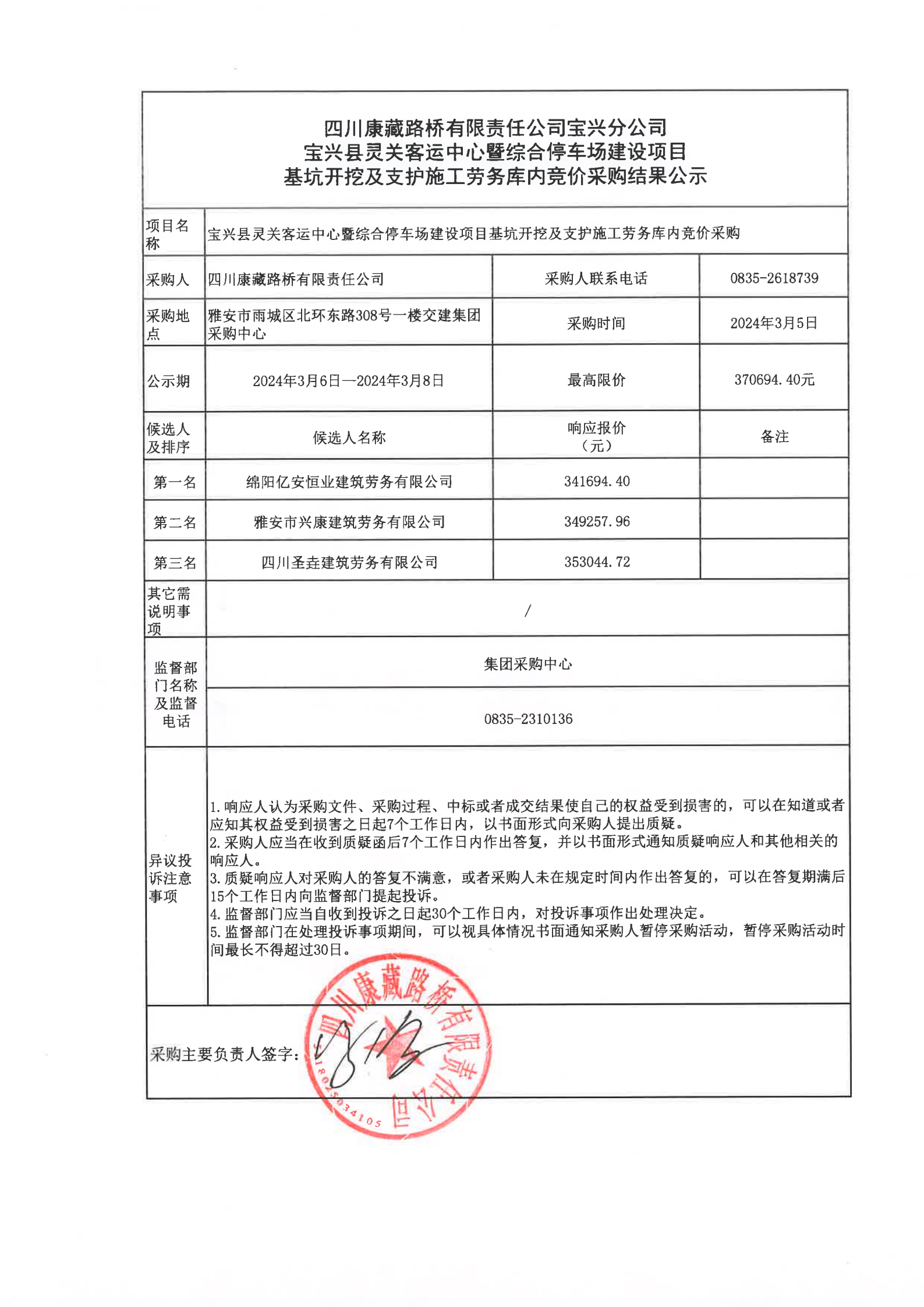 四川康藏路橋有限責(zé)任公司寶興分公司寶興縣靈關(guān)客運(yùn)中心暨綜合停車場建設(shè)項目基坑開挖及支護(hù)施工勞務(wù)庫內(nèi)競價采購結(jié)果公示