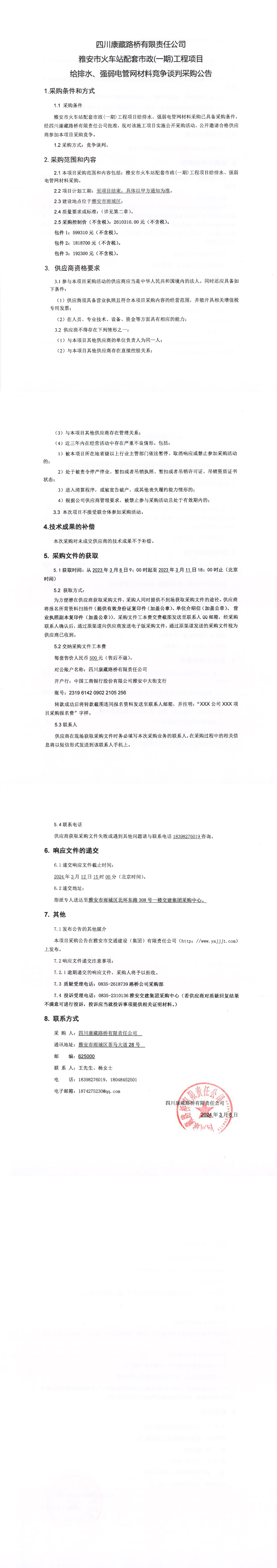 四川康藏路橋有限責(zé)任公司雅安市火車站配套市政(一期)工程項(xiàng)目給排水、強(qiáng)弱電管網(wǎng)材料競(jìng)爭(zhēng)談判采購(gòu)公告