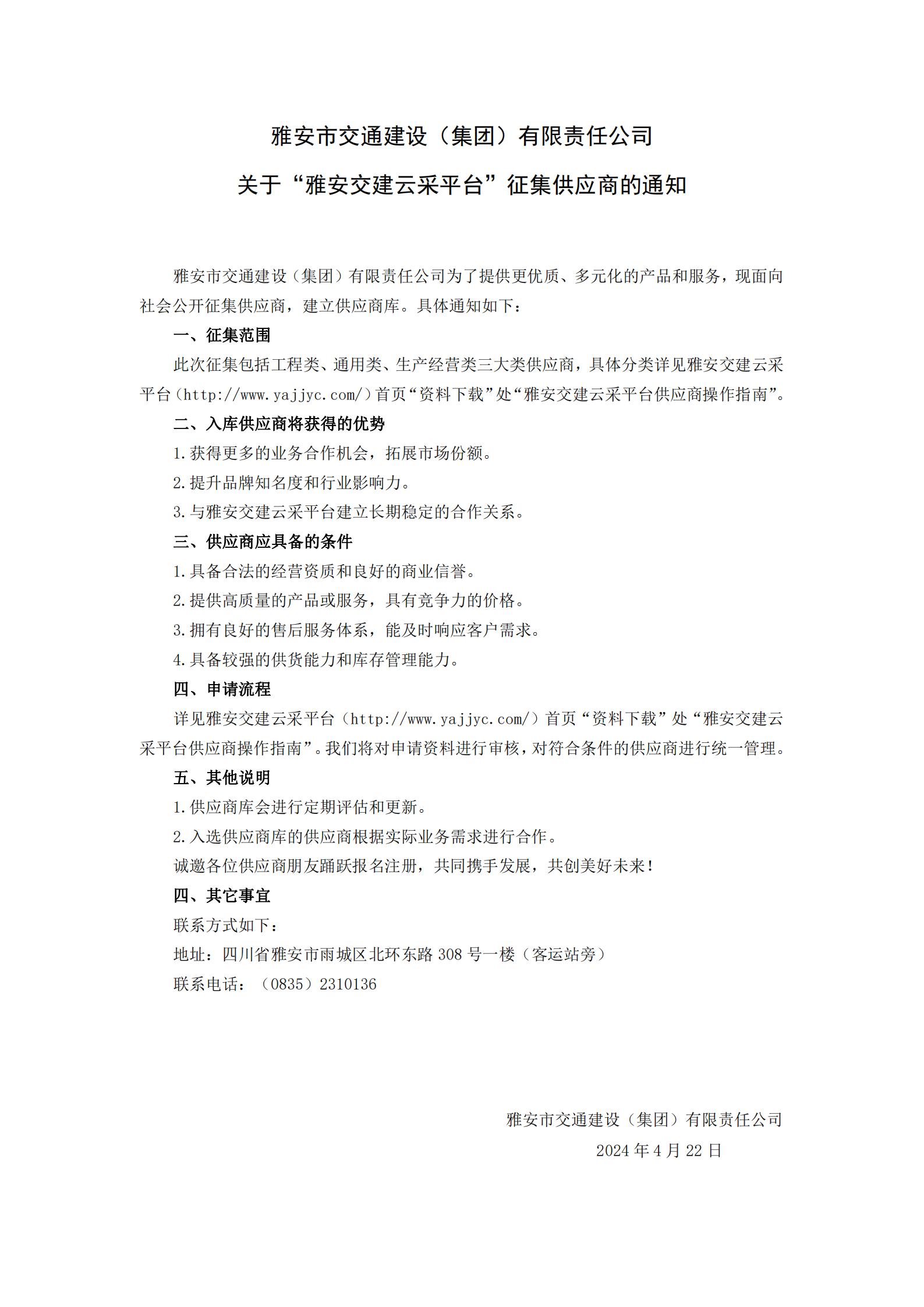 雅安市交通建設(shè)(集團)有限責(zé)任公司關(guān)于“雅安交建云采平臺”征集供應(yīng)商的通知