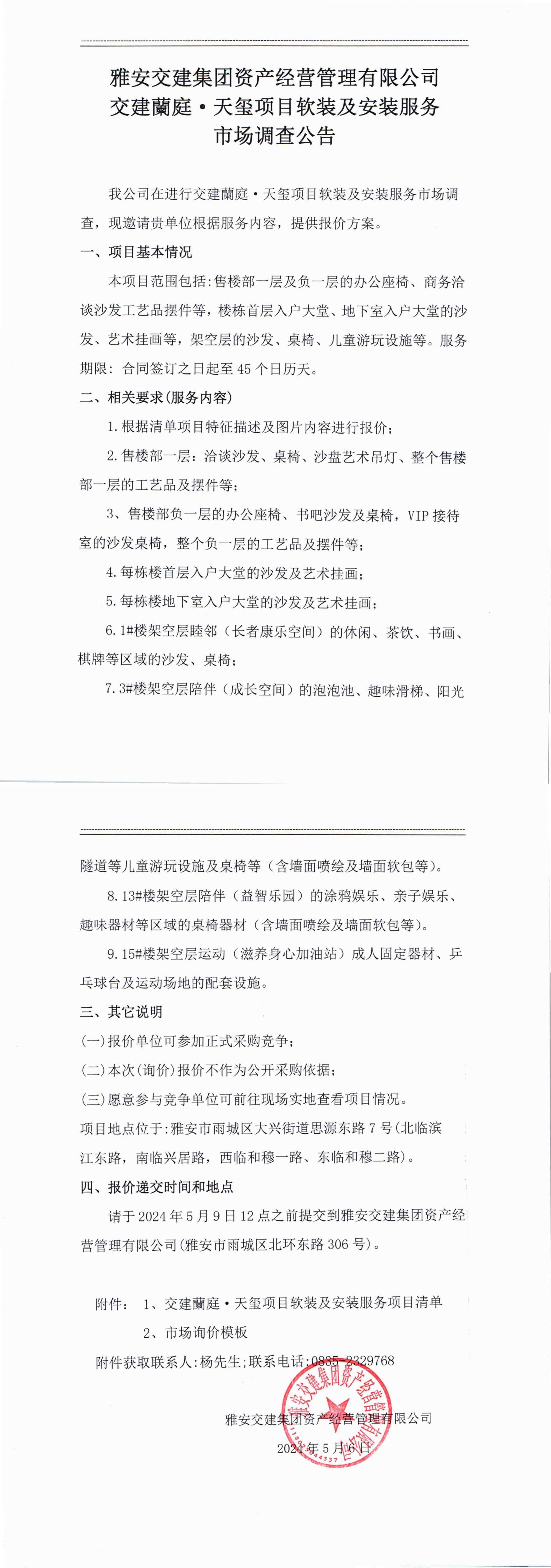 雅安交建集團(tuán)資產(chǎn)經(jīng)營管理有限公司交建蘭庭·天璽項(xiàng)目軟裝及安裝服務(wù)市場調(diào)查公告