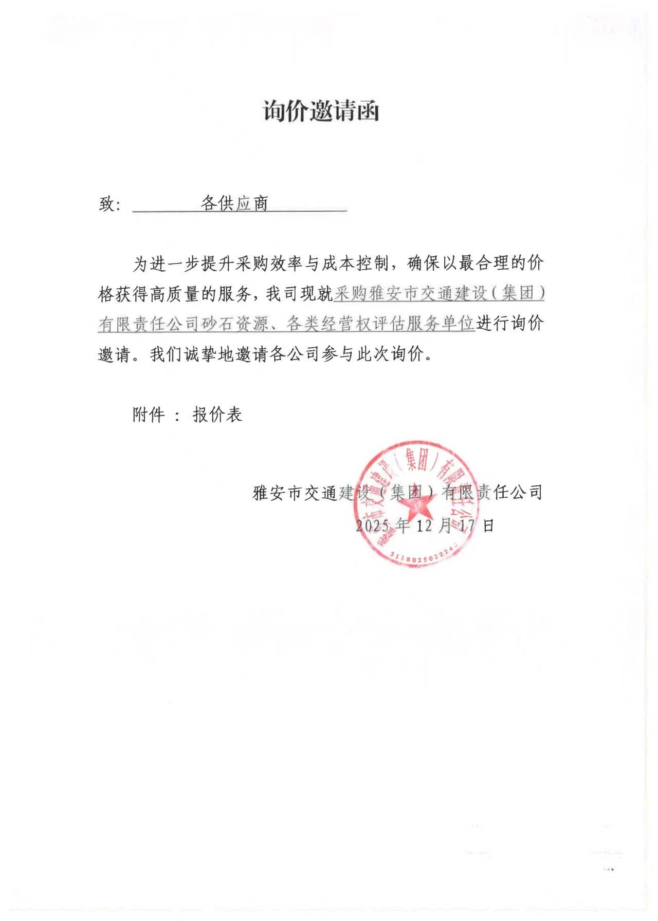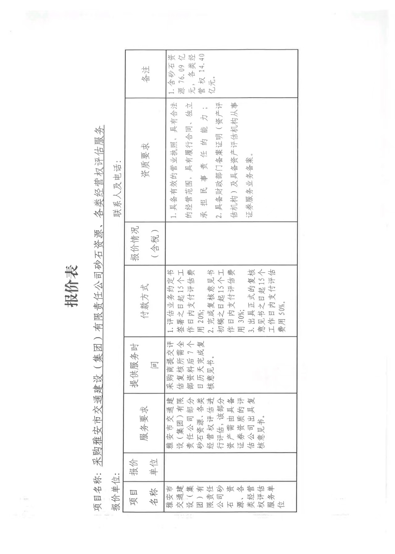 關(guān)于雅安市交通建設(shè)(集團)有限責任公司砂石資源、各類經(jīng)營權(quán)評估服務(wù)限價的詢價函