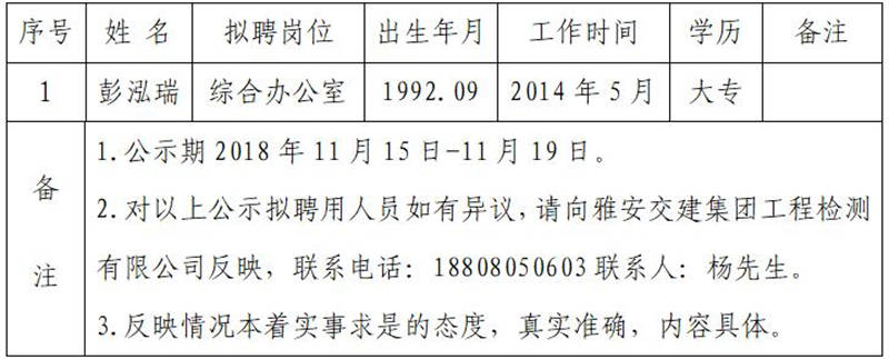 雅安交建集團(tuán)工程檢測(cè)有限公司擬聘用人員公示