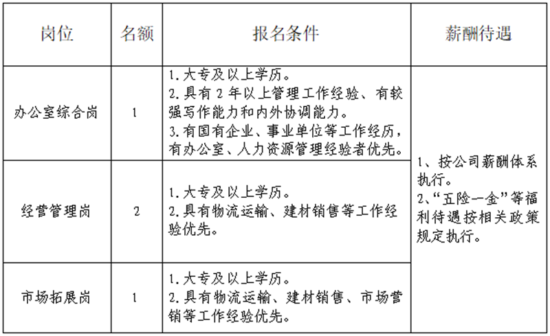 雅安交建集團運通貿易有限公司是雅安市交通建設(集團)有限責任公司下屬子公司。主要從事普通貨運、建材銷售、供應鏈管理、貨運代理、貨運信息咨詢服務、倉儲配送服務等工作,F根據公司業(yè)務發(fā)展需要,決定招聘4名工作人員,現將有關事項公告如下: