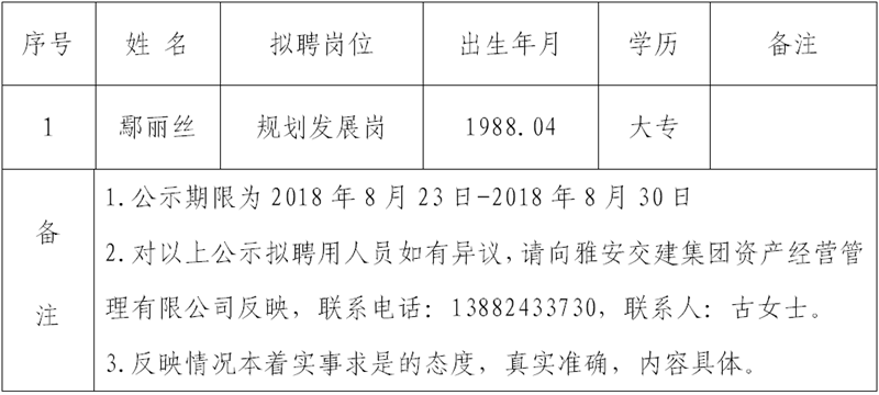 通過公開報名、資格審查、綜合測試等程序,經(jīng)雅安交建集團(tuán)資產(chǎn)經(jīng)營管理有限公司研究確定以下1名擬聘用人員,現(xiàn)公示名單如下: