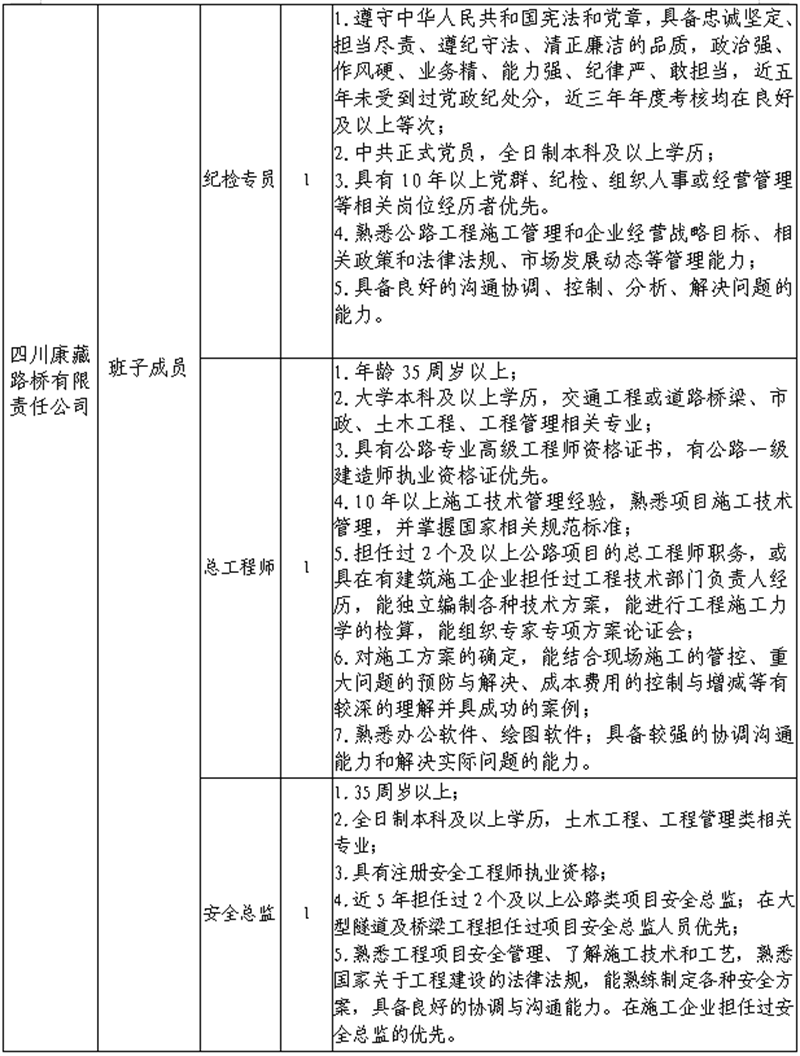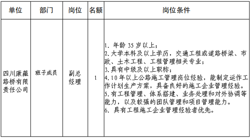 根據(jù)發(fā)展需要,決定面向社會(huì)公開(kāi)招聘雅安市交通建設(shè)(集團(tuán))有限責(zé)任公司(以下簡(jiǎn)稱“雅安交建集團(tuán)”)所屬子公司班子成員4名,現(xiàn)將有關(guān)事項(xiàng)公告如下:
