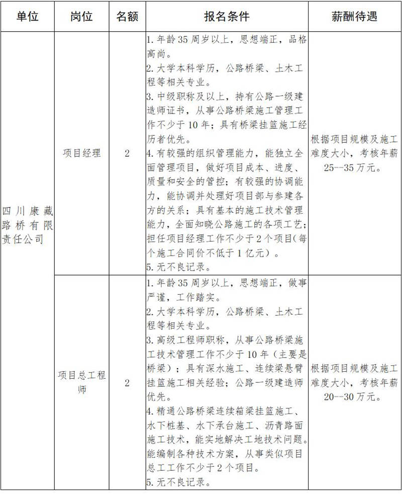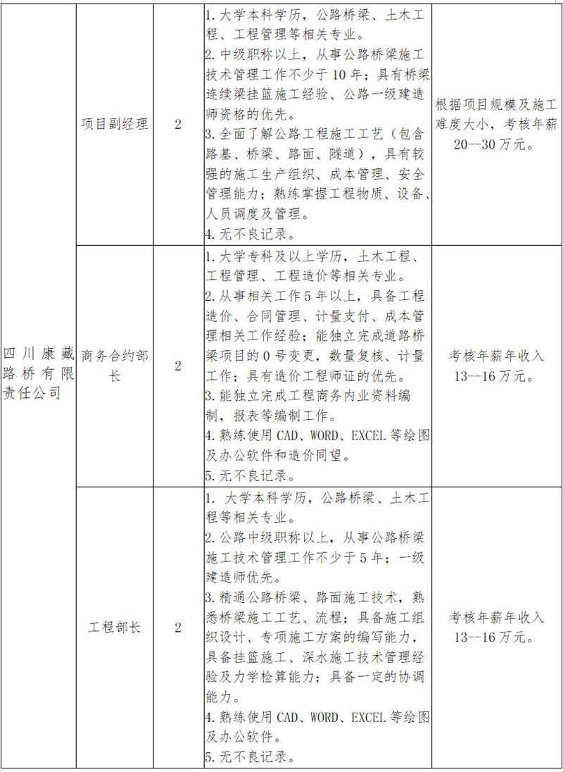 根據(jù)發(fā)展需要,決定面向社會(huì)公開招聘雅安市交通建設(shè)(集團(tuán))有限責(zé)任公司(以下簡稱“雅安交建集團(tuán)”)所屬子公司工程項(xiàng)目主要負(fù)責(zé)人10名,現(xiàn)將有關(guān)事項(xiàng)公告如下: