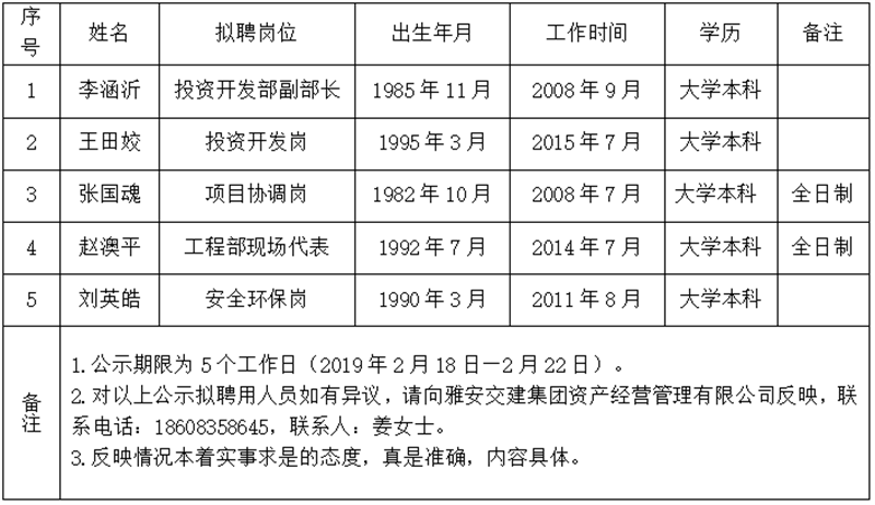 通過公開報名、資格審查、筆試、面試等程序,經雅安交建集團資產經營管理有限公司研究,對以下