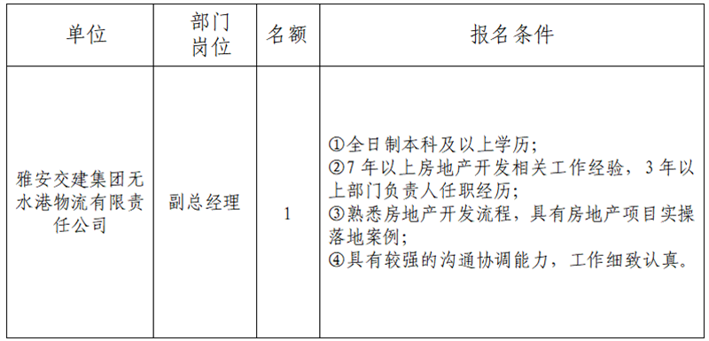 根據(jù)發(fā)展需要,現(xiàn)面向社會公開招聘雅安市交通建設(shè)(集團(tuán))有限責(zé)任公司(以下簡稱“雅安交建集團(tuán)”)所屬子公司經(jīng)營班子人員1名,現(xiàn)將有關(guān)事項(xiàng)公告如下: