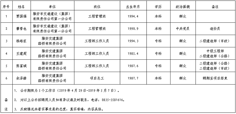 雅安交建集團子公司擬聘用人員公示(路橋公司、第一分公司)