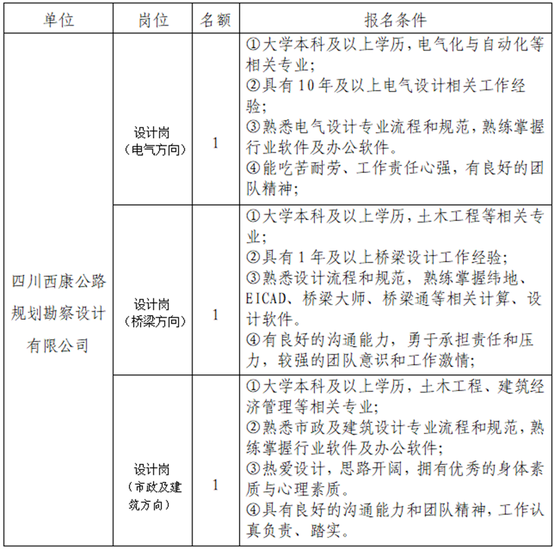 根據(jù)發(fā)展需要,決定面向社會公開招聘雅安市交通建設(集團)有限責任公司(以下簡稱“雅安交建集團”)所屬子公司專業(yè)技術人才3名,現(xiàn)將有關事項公告如下: