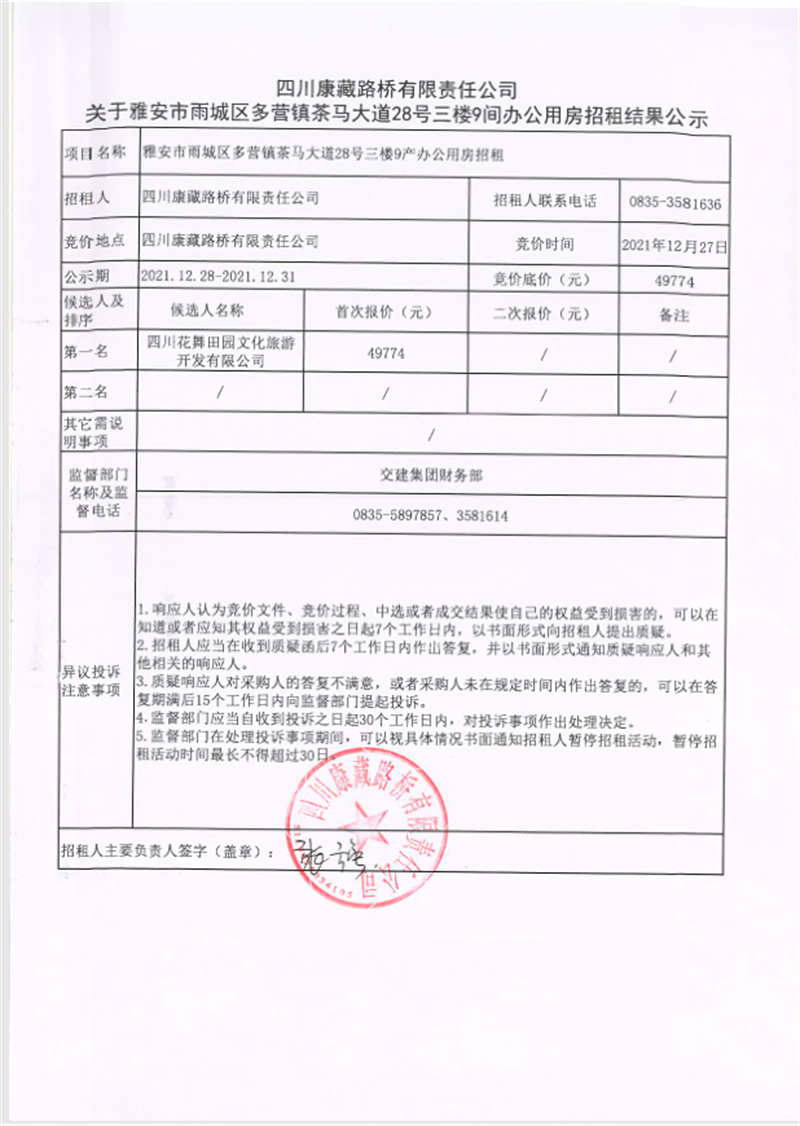 四川康藏路橋有限責任公司關于雅安市雨城區(qū)多營鎮(zhèn)茶馬大道28號三樓9間辦公用房招租結(jié)果的公示