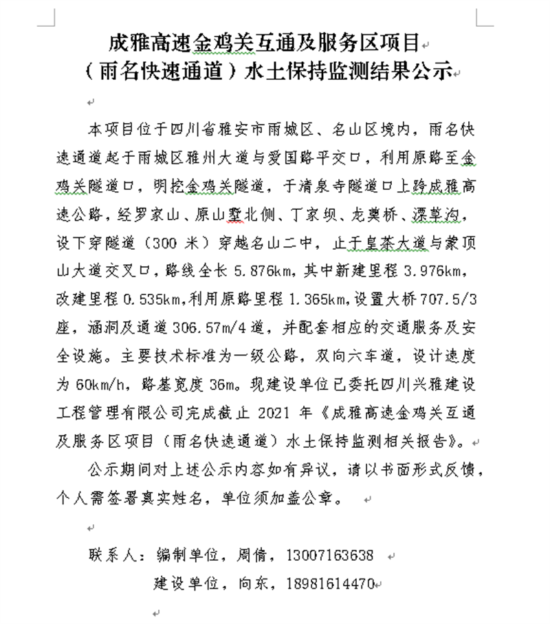 成雅高速金雞關(guān)互通及服務(wù)區(qū)項(xiàng)目(雨名快速通道)水土保持監(jiān)測結(jié)果公示