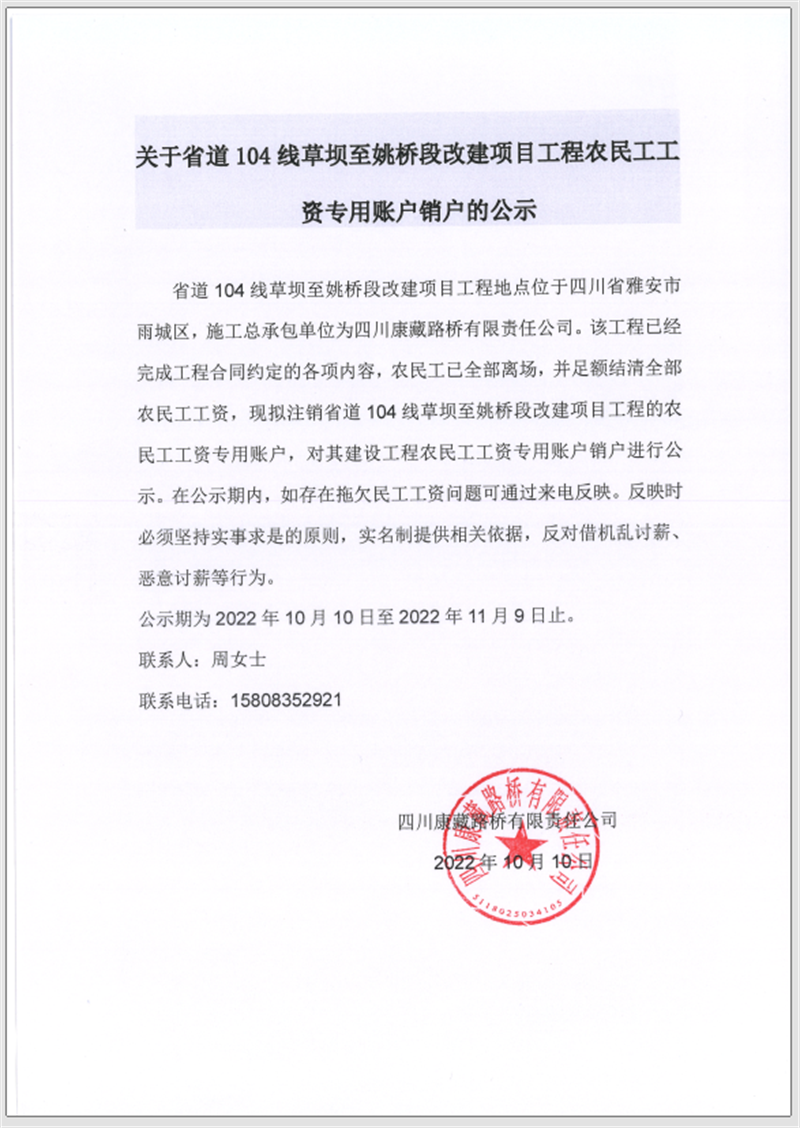 關(guān)于省道104線(xiàn)草壩至姚橋段改建項(xiàng)目工程農(nóng)民工工資專(zhuān)用賬戶(hù)銷(xiāo)戶(hù)的公告