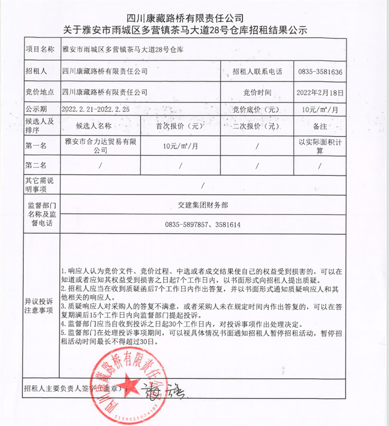 四川康藏路橋有限責(zé)任公司關(guān)于雅安市雨城區(qū)多營鎮(zhèn)茶馬大道28號倉庫招租結(jié)果的公示