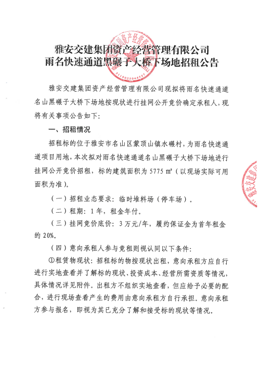 雅安交建資產(chǎn)經(jīng)營(yíng)管理有限公司雨名快速通道黑碾子場(chǎng)地招租公告