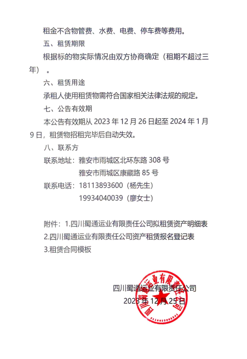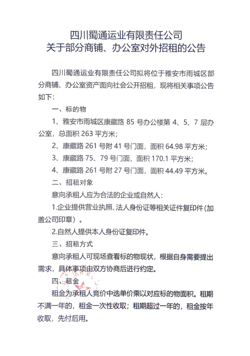 四川蜀通運(yùn)業(yè)有限責(zé)任公司關(guān)于部分商鋪、辦公室對(duì)外招租的公告