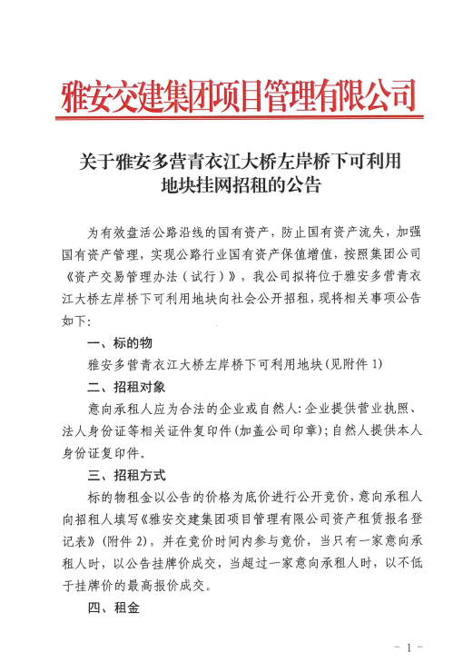 雅安交建集團(tuán)項(xiàng)目管理有限公司關(guān)于雅安多營青衣江大橋左岸橋下可利用地塊掛網(wǎng)招租的公告