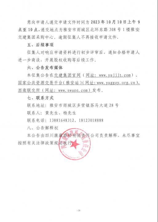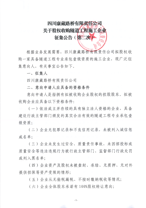 四川康藏路橋有限責(zé)任公司關(guān)于股權(quán)收購(gòu)隧道工程施工企業(yè)征集公告(第二次)