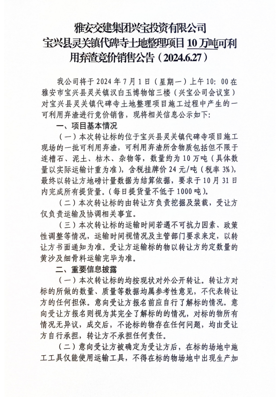 雅安交建集團(tuán)興寶投資有限公司寶興縣靈關(guān)鎮(zhèn)代碑寺土地整理項(xiàng)目10萬噸可利用棄渣競(jìng)價(jià)銷售公告(2024.6.27)