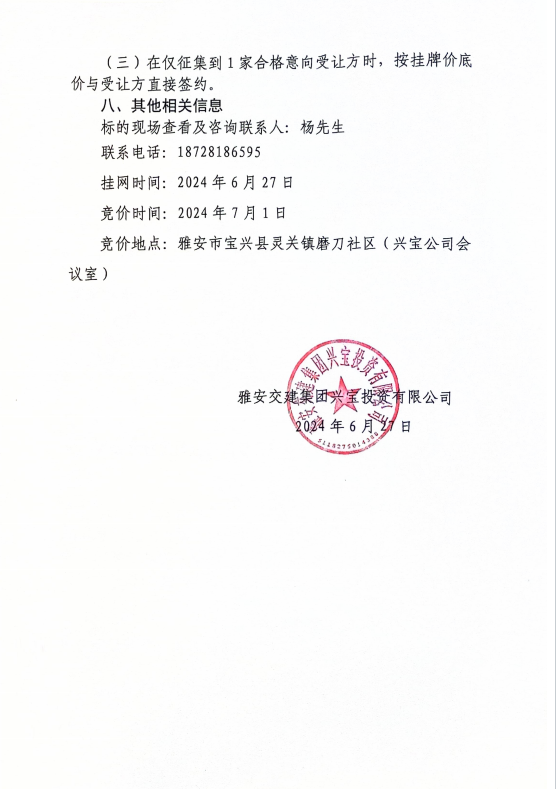雅安交建集團(tuán)興寶投資有限公司寶興縣靈關(guān)鎮(zhèn)代碑寺土地整理項(xiàng)目10萬噸可利用棄渣競(jìng)價(jià)銷售公告(2024.6.21)