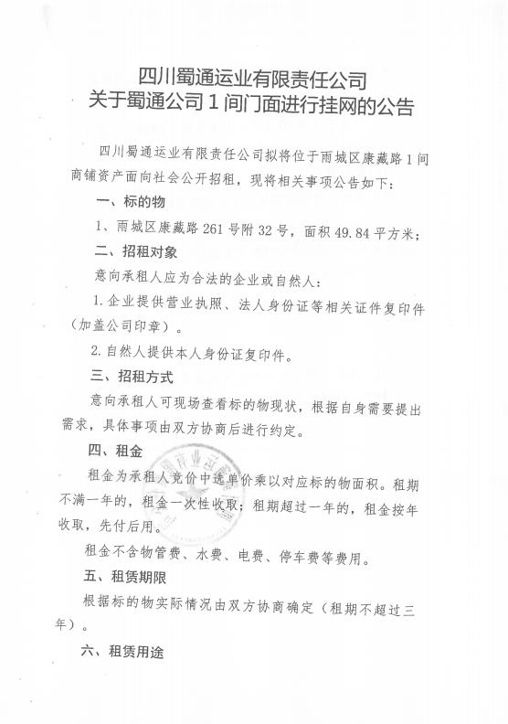 四川蜀通運業(yè)有限責任公司關于蜀通公司1間門面進行掛網(wǎng)的公告