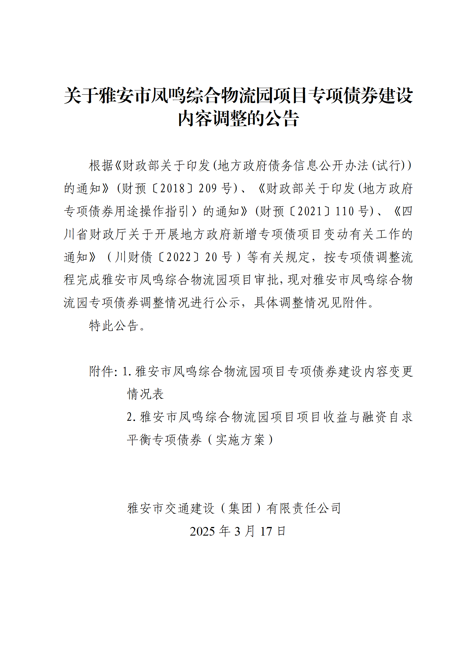 關(guān)于雅安市鳳鳴綜合物流園項(xiàng)目專項(xiàng)債券建設(shè)內(nèi)容調(diào)整的公告