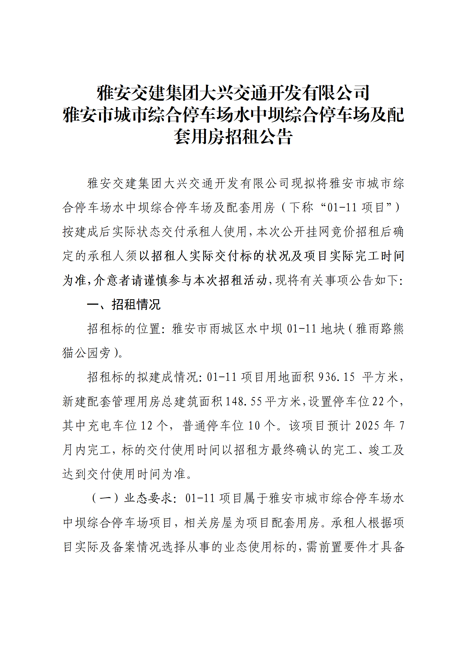 雅安交建集團(tuán)大興交通開發(fā)有限公司 雅安市城市綜合停車場水中壩綜合停車場及配套用房招租公告