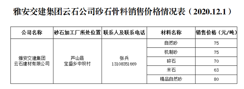 雅安交建集團(tuán)云石公司砂石骨料銷售價(jià)格情況表(2020.12.1)