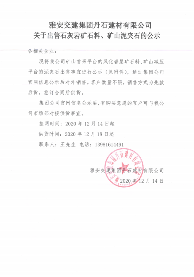 雅安交建集團丹石建材有限公司關(guān)于出售石灰?guī)r礦山料、礦山泥夾石的公示