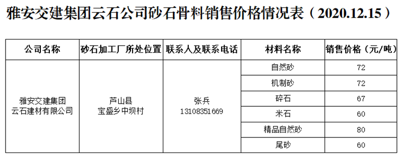 雅安交建集團(tuán)云石公司砂石骨料銷售價(jià)格情況表(2020.12.15)