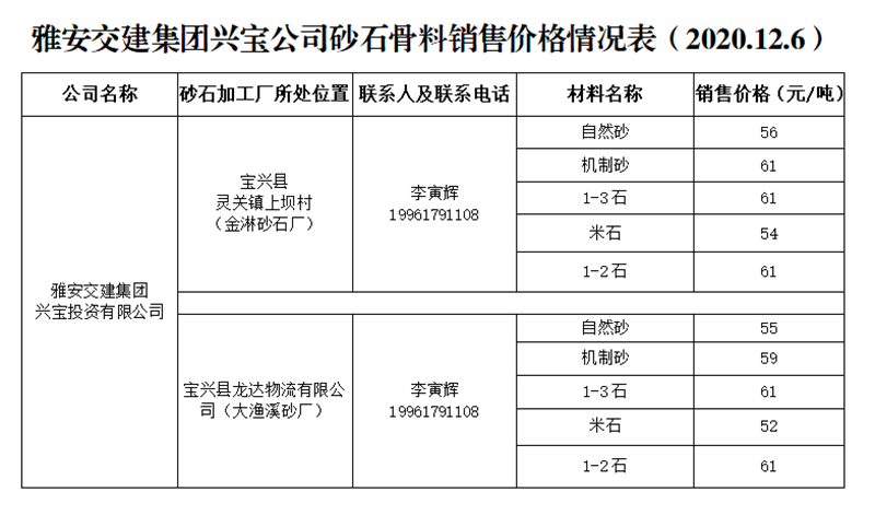 ÑŰ²½»½¨¼¯ˆFÅdŒš¹«Ë¾É°Ê¯¹ÇÁÏäNÊÛƒr¸ñÇé›r±í£¨2020.12.6£©