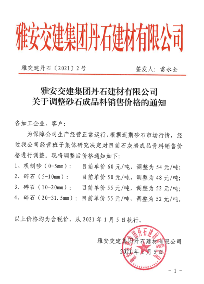 雅安交建集團丹石公司石灰?guī)r成品骨料掛牌價(2021.1.5)