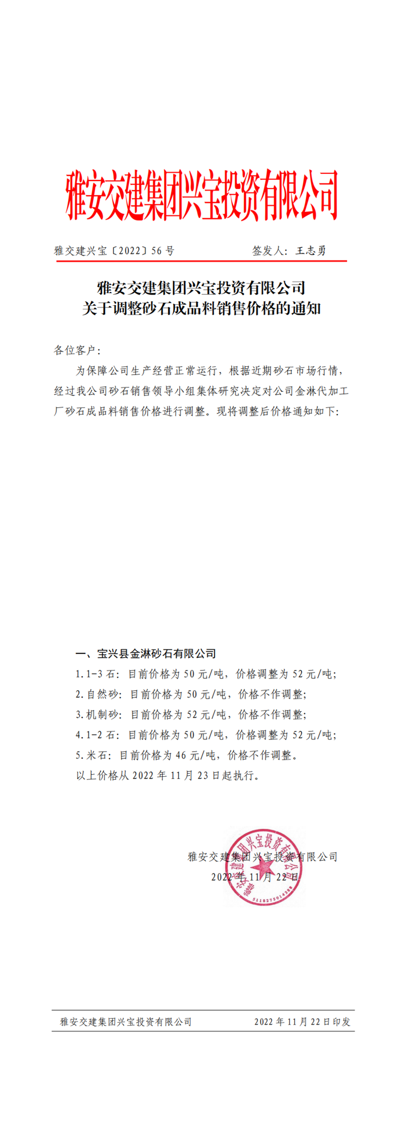 雅交建興寶〔2022〕56號 關(guān)于調(diào)整砂石成品料銷售價格的通知-11.22