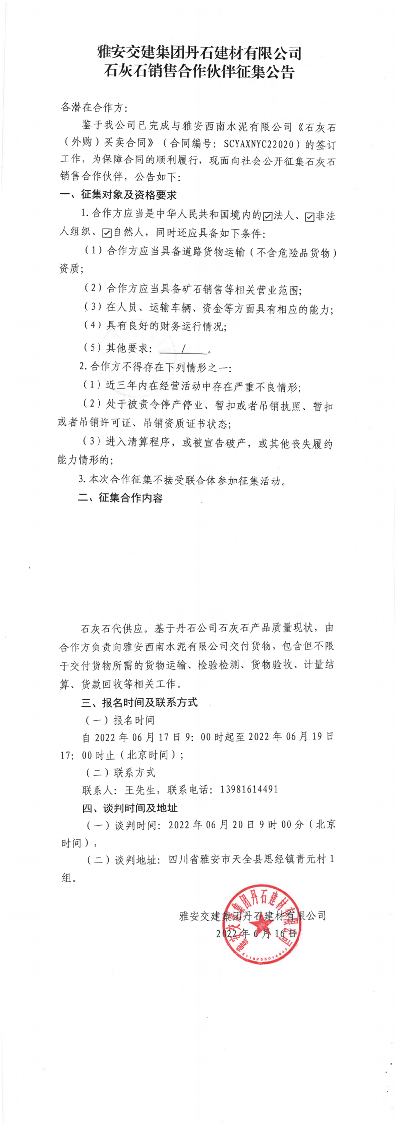 雅安交建集團(tuán)丹石建材有限公司石灰石銷售合作伙伴征集公告6-16