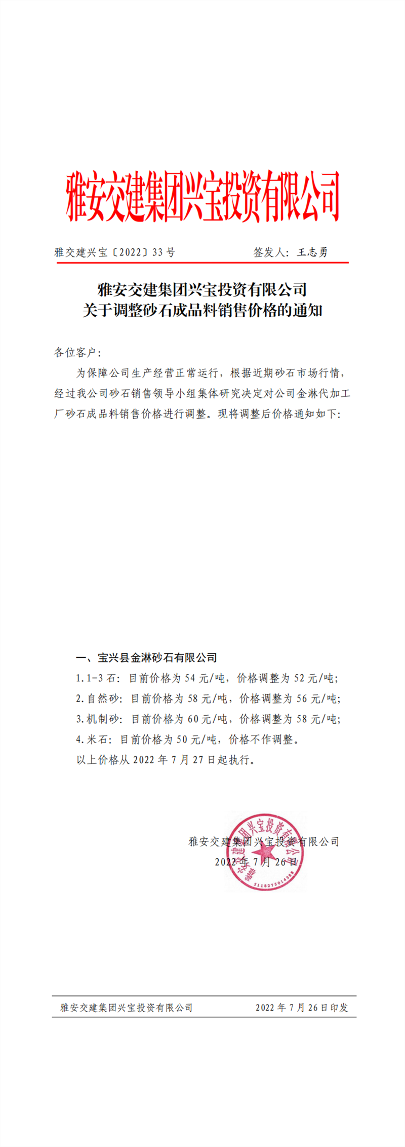 雅交建興寶〔2022〕33號 關(guān)于調(diào)整砂石成品料銷售價格的通知--7.27