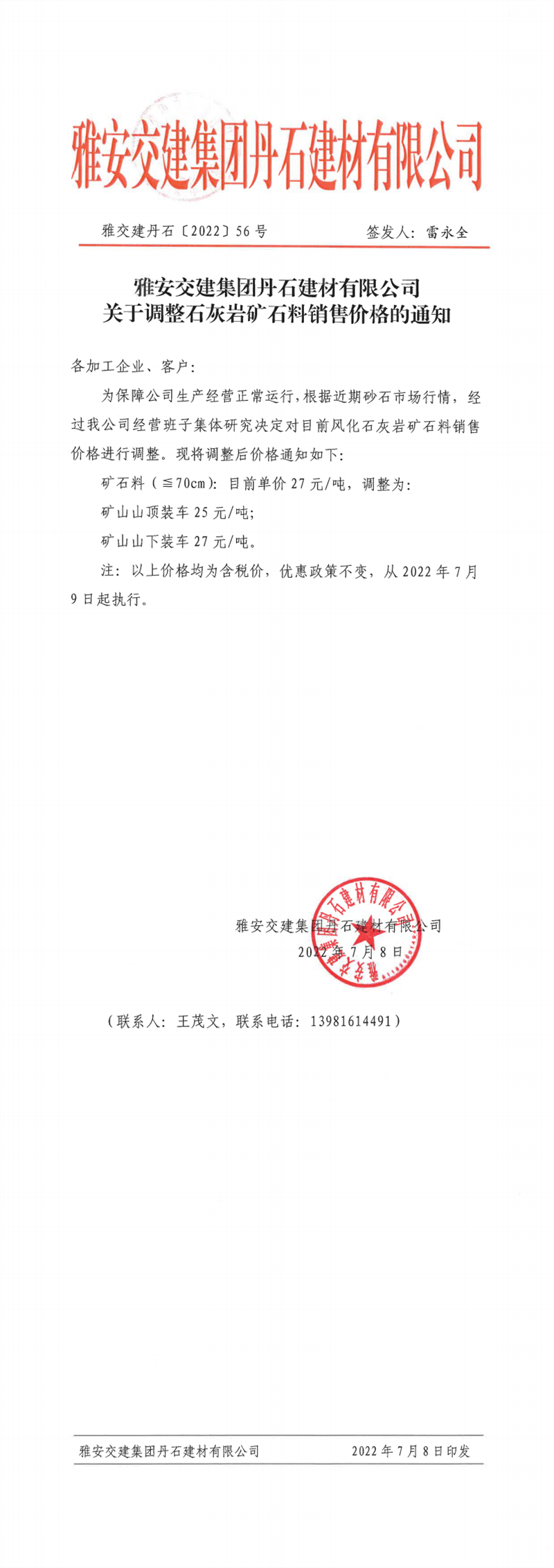雅交建丹石關于調整石灰?guī)r礦石料銷售價格的通知(2022-7-8)