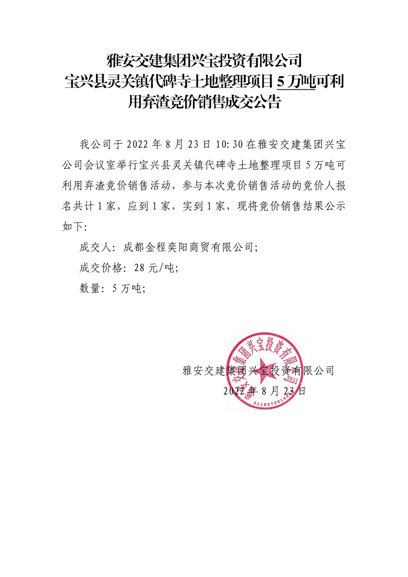 雅安交建集團(tuán)興寶投資有限公司寶興縣靈關(guān)鎮(zhèn)代碑寺土地整理項(xiàng)目10萬(wàn)噸可利用棄渣競(jìng)價(jià)銷售成交公告(8.23)