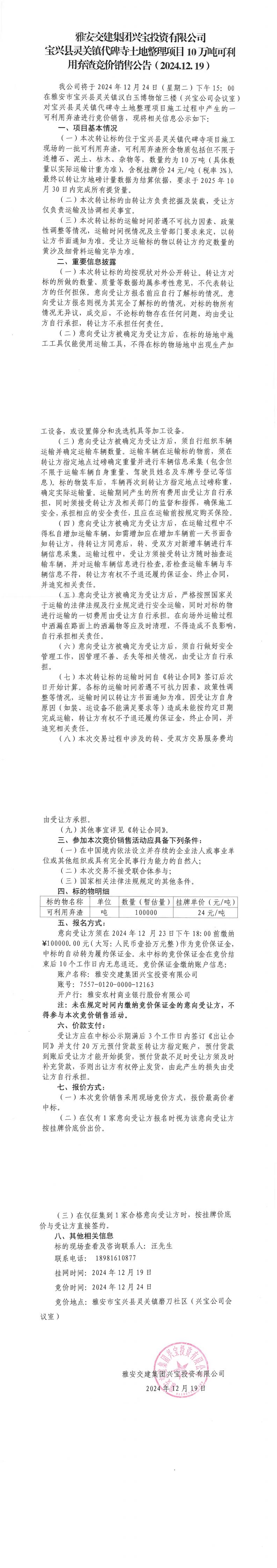 雅安交建集團(tuán)興寶投資有限公司靈關(guān)鎮(zhèn)代碑寺土地整理項(xiàng)目10萬(wàn)噸可利用棄渣競(jìng)價(jià)銷(xiāo)售公告(2024.12.19)