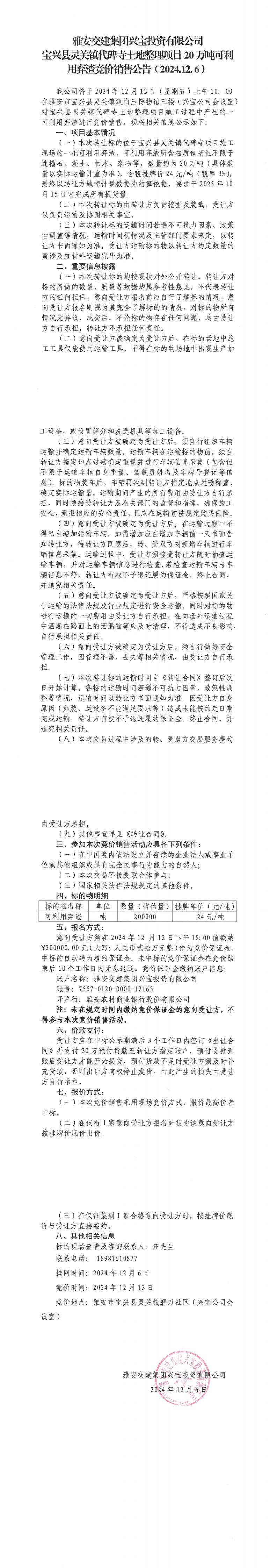 雅安交建集團(tuán)興寶投資有限公司靈關(guān)鎮(zhèn)代碑寺土地整理項(xiàng)目10萬(wàn)噸可利用棄渣競(jìng)價(jià)銷售公告(2024.12.06)
