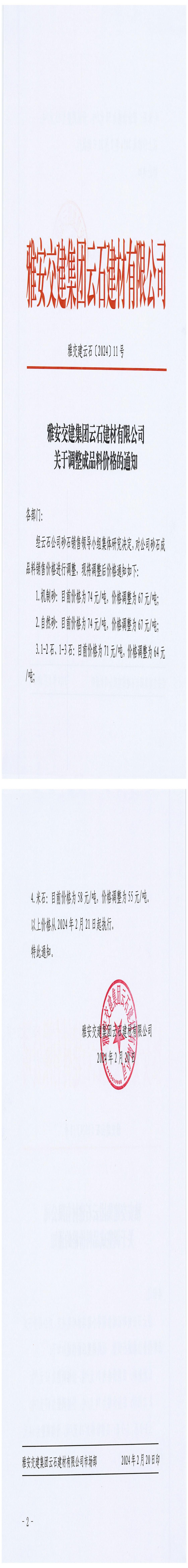 雅安交建集團(tuán)云石建材有限公司成品料價格調(diào)整公告(2024-2-21)