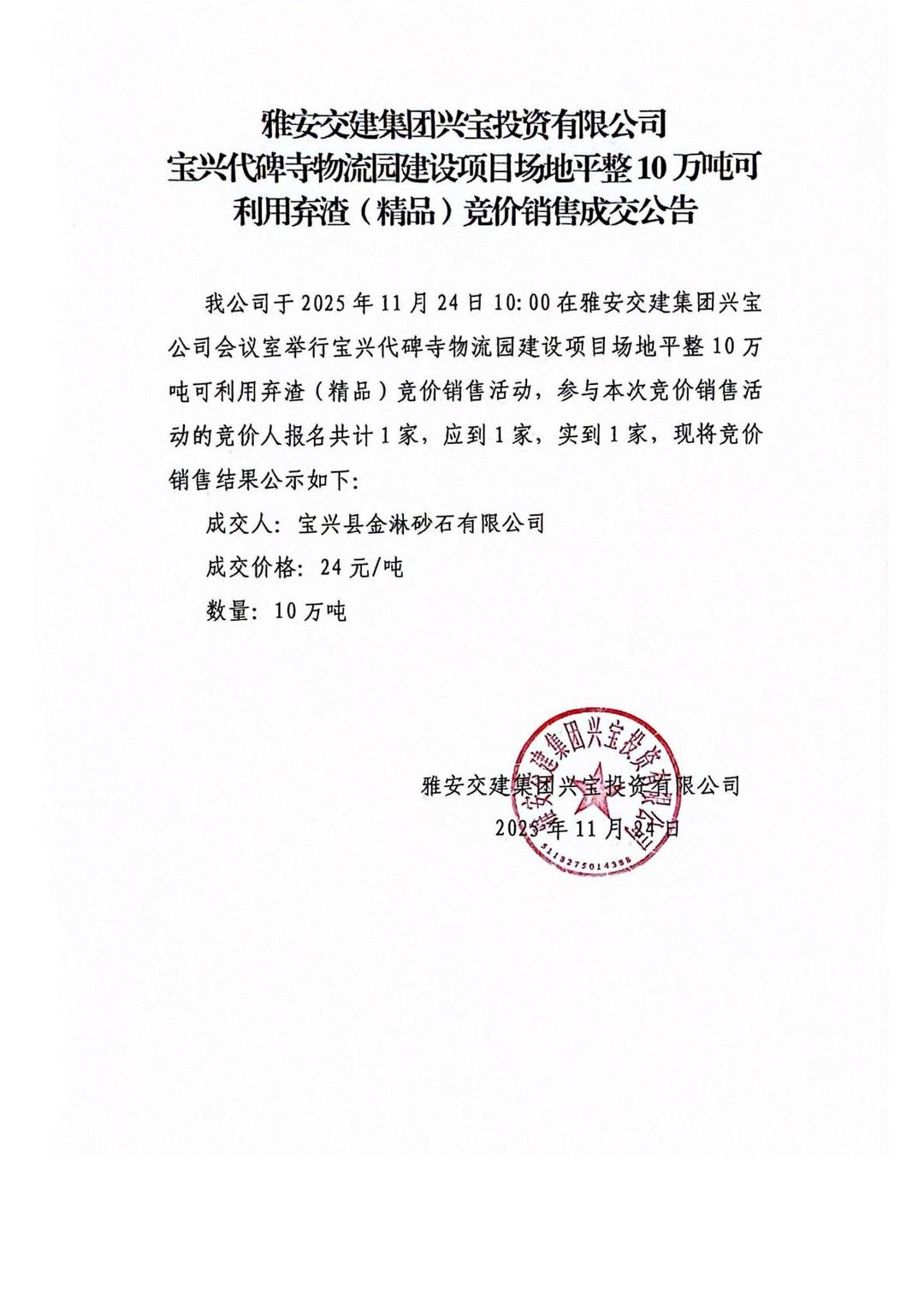 雅安交建集團(tuán)興寶投資有限公司10萬(wàn)噸可利用棄渣(精品)競(jìng)價(jià)銷售成交公告(2025.11.24)
